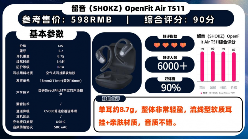 第七款推荐、韶 音 Op en Fi t A i r T 5 11——899元