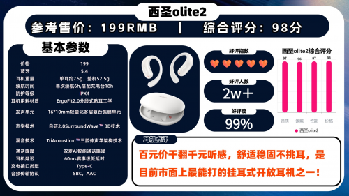 西圣Olite2被权威媒体誉为“百元价位最能媲美千元耳机的最强存在,西圣出口欧美多年,专为高端数码用户设计,罕见地荣获CCTV央视展播推荐。作为行业内性价比最强的开放式耳机品牌,它不仅打破了高品质音质的价格壁垒,而且真正做到用百元价格打穿千元音质!因为品质工艺严苛,在各大中高端口碑、销量排行榜中常年霸榜第一!